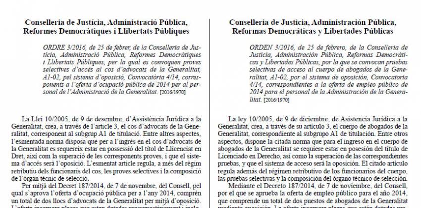 ORDEN 3/2016, de 25 de febrero, de la Conselleria de Justicia, Administración Pública, Reformas Democráticas y Libertades Públicas, por la que se convocan pruebas selectivas de acceso al cuerpo de abogados de la Generalitat, A1-02, por el sistema de oposición, Convocatoria4/14, correspondientes a la oferta de empleo público de 2014 para el personal de la Administración de la Generalitat.